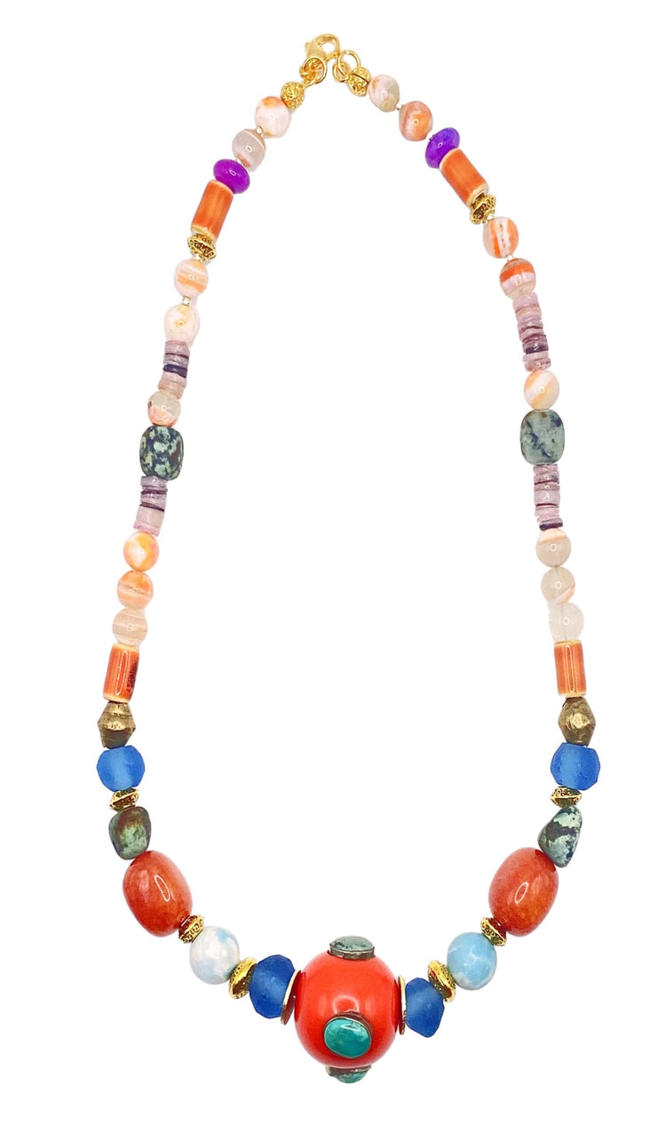 - Gemstones used: Resin pendant with Howlite Inlay beads, Recycled Glass beads, Jade, Amazonite, Turquoise, Ceramic beads, Opal, Shell beads, Jade, Brass beads, Gold Plated spacers Gold plated logo tag