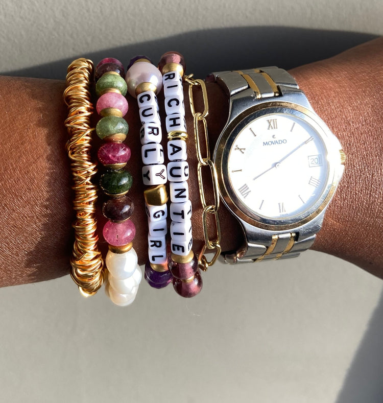 This bracelet is for all the amazing women who proudly embrace their natural curls. There was a time when curly hair wasn’t celebrated, but now we can’t get enough of letting our curls shine. No matter the texture, your curls are beautiful, and this bracelet is a stylish way to show the world how much you love them. It’s a bold affirmation of self-love and confidence in your natural beauty. Great job loving yourself—now grab this bracelet to let everyone know how proud you are, too! Please inquire about custom sizes.