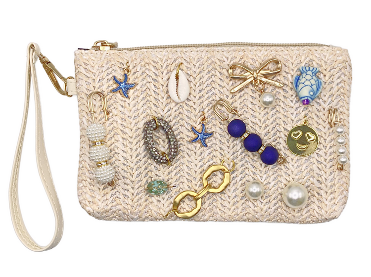 Experience luxury and uniqueness with our Charm Wristlet, featuring hand-curated charms on a stylish woven straw design. Perfect for a day at the beach or a night on the town, this one-of-a-kind wristlet is a must-have for any fashion-forward individual. Elevate your style and make a statement with our Charm Wristlet.