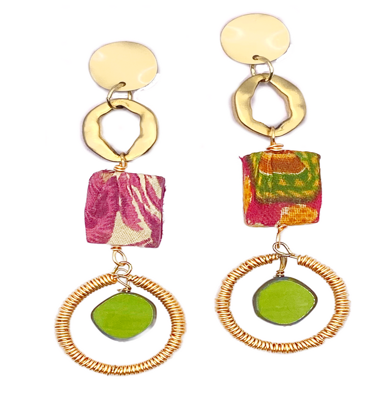 Take a daring leap with our OOAK Kantha Statement Earrings! Featuring a one of a kind design, each earring boasts a unique kantha cloth square bead, gold plated beads, czech glass, and gold plated wire wrapped accents. Make a bold statement with these daring and adventurous earrings!