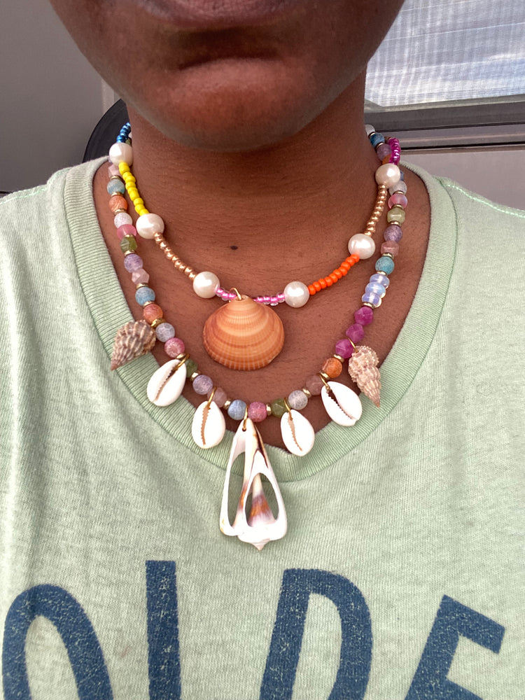 Bright, bold, and undeniably beautiful—this handmade gemstone necklace features vibrant tourmaline beads and a striking real Strawberry Strombus shell pendant. Each piece is designed to make a statement, blending tropical elegance with natural luxury. The rich spectrum of color in the tourmaline gemstones reflects creativity, confidence, and joy, while the one-of-a-kind seashell adds an organic, coastal touch. One of a kind.