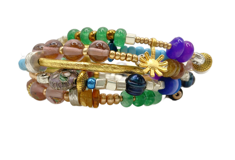 A unique mix of colors create the perfect statement piece for you. Created with carefully curated beads, gemstones, and gold-plated tubes, this stunning piece effortlessly elevates any look. Its 6 connected rows on a memory wire create one complete and beautifully adorned bracelet.