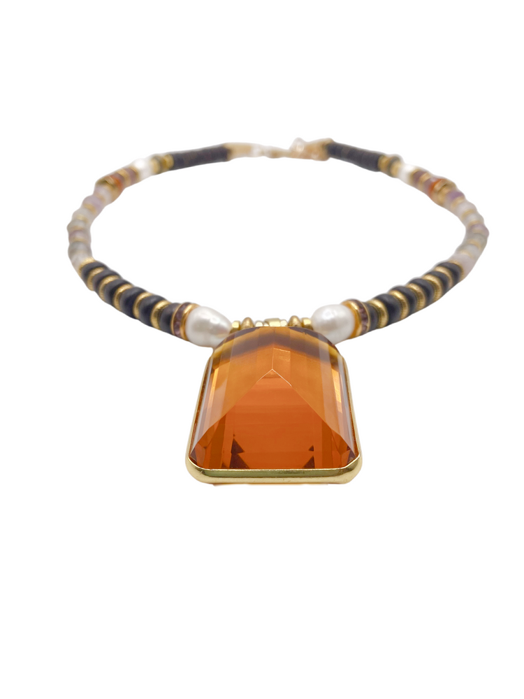This necklace will be the stand out piece in your jewelry collection. The Amber hued Quartz paired with pearls and Fluorite come together beautifully as a true piece of art.