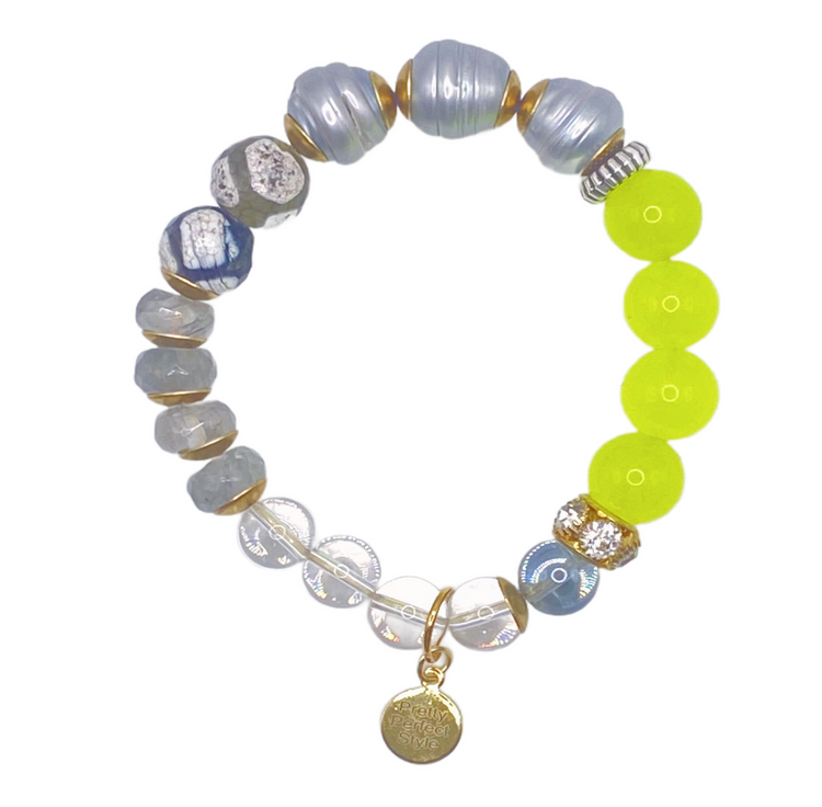 Featuring jumbo gray pearls and a pop of neon, this one of a kind bracelet exudes a unique mix of the cutest gemstones. Elevate any outfit with a touch of elegance and playfulness.
