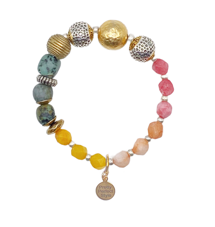 Soft hues of the sunrise blend seamlessly with vibrant turquoise and mixed metal accents, creating a bracelet that glows with warmth and energy. Handcrafted for effortless styling, this piece adds a touch of bohemian elegance to any stack. Versatile, bold, and timeless, it’s the perfect way to carry the beauty of dawn wherever you go.