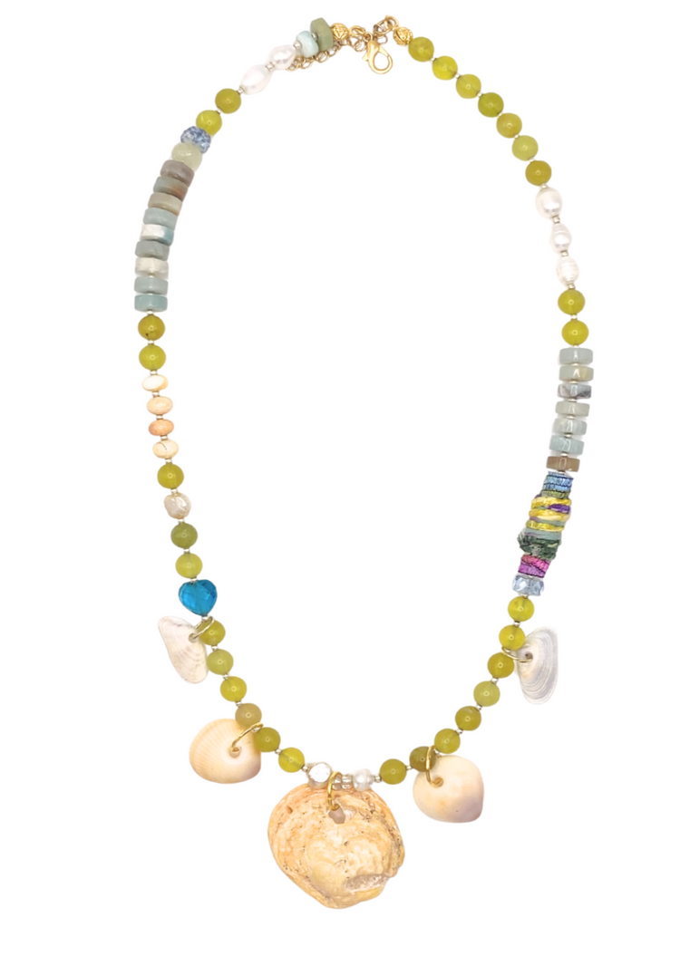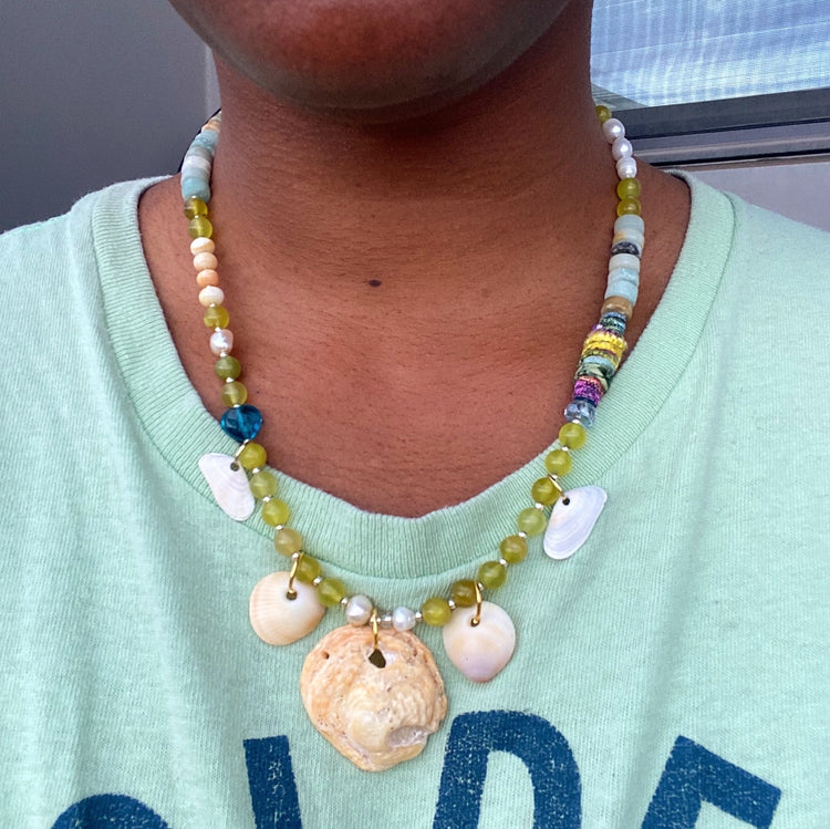 Radiant, refined, and one-of-a-kind, this necklace is a show-stopping piece that combines the luxury of fine jewelry with the fresh vibrance of the sea. Featuring a luminous shell charm paired with a striking bright green gemstone, this necklace exudes high-end coastal elegance. Its bold yet balanced design makes it the perfect statement accessory for both elevated beachwear and sophisticated evening looks.