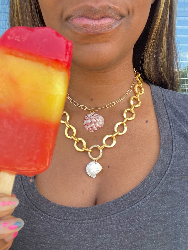 Crafted from thick, durable gold plating, the chunky chain adds weight and boldness, while the natural seashell charm brings in a touch of organic elegance. Whether styled with a sleek black dress or a casual white tee, this necklace commands attention and instantly elevates your look.