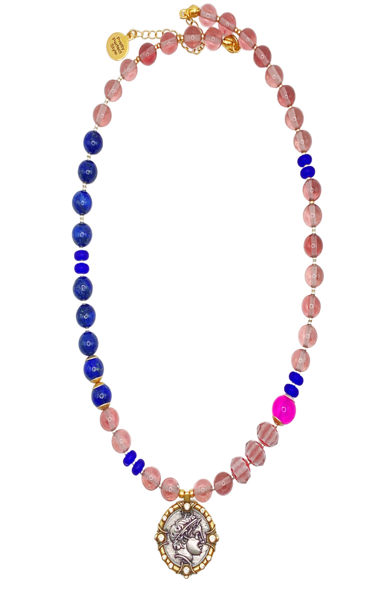 Handcrafted to perfection, this gold and antique silver pendant showcases deep navy and soft lavender gemstones, evoking the magic of ancient Greece. Bold yet timeless, it’s designed for year-round elegance, effortlessly complementing any look. A true collector’s piece that blends history, luxury, and modern style.