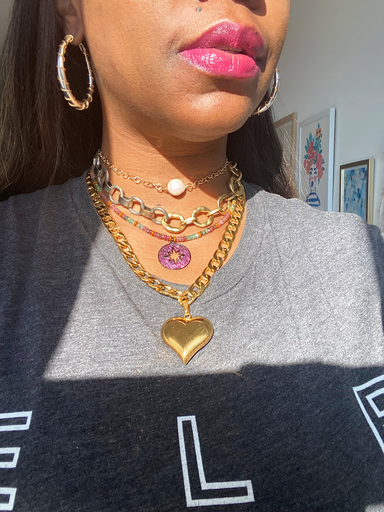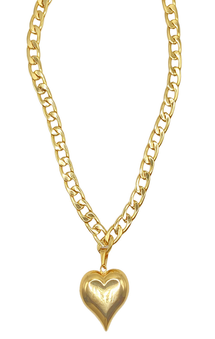 Dripping in radiant gold, this stunning large-link necklace features an oversized puffy heart pendant that exudes elegance and confidence. Its long, versatile design makes it perfect for layering, while the bold silhouette drapes effortlessly over a V-neck, creating a flawless statement. Timeless, striking, and undeniably chic—this is the ultimate head-turner for those who love to shine.